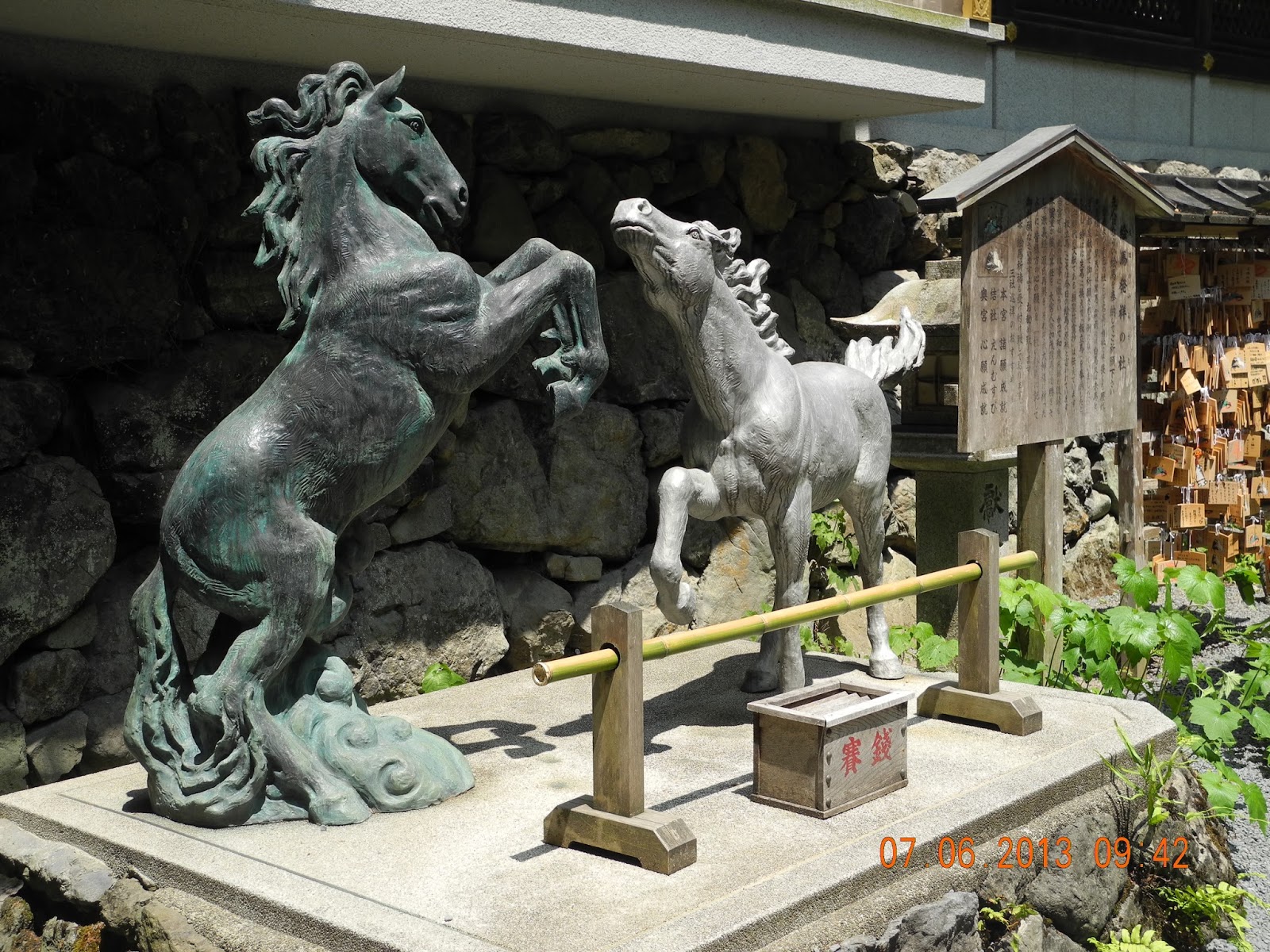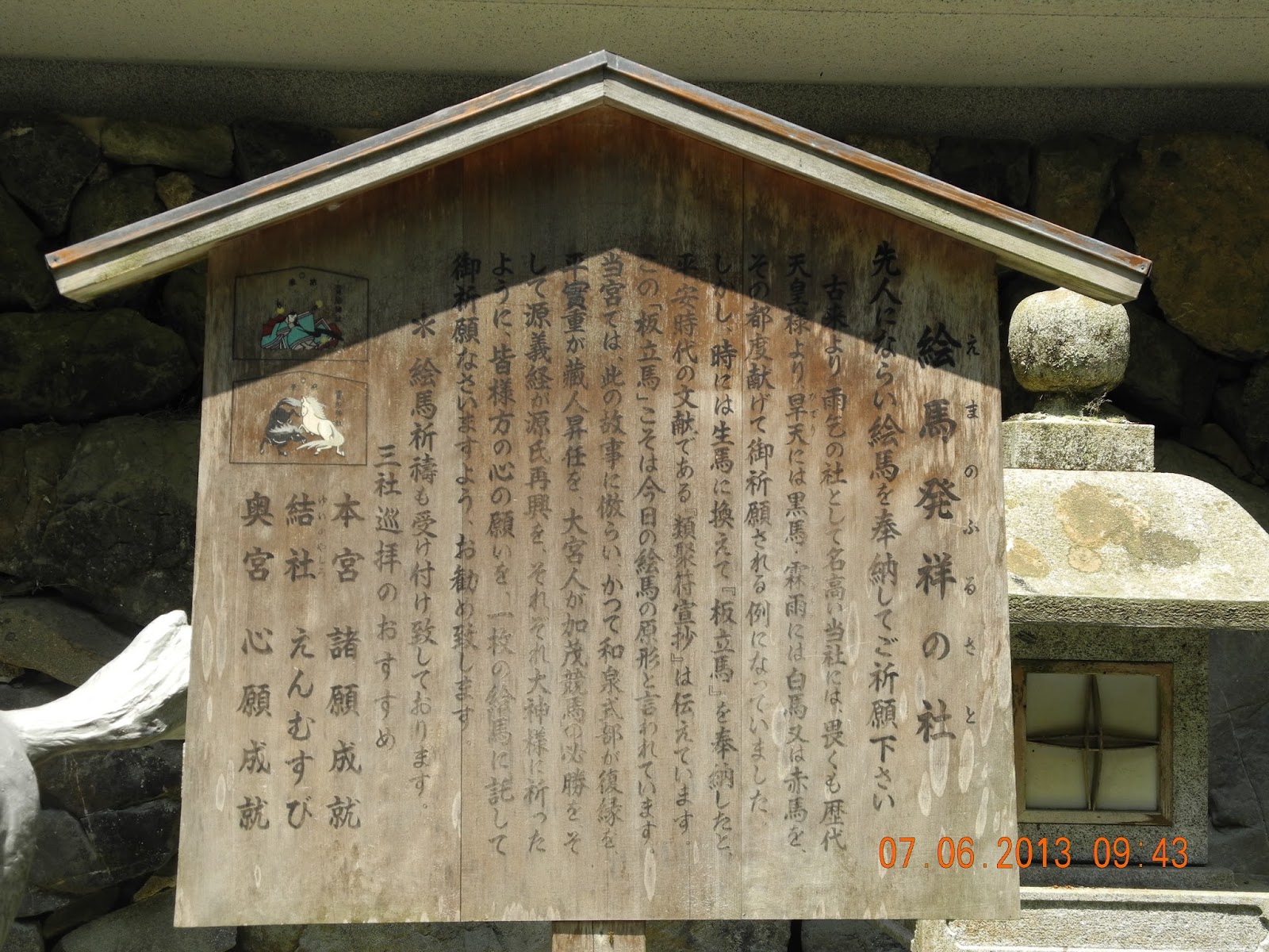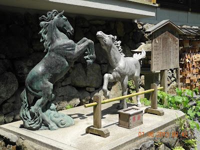 神社祭祀高龗神たかおかみのかみ(夢枕獏《少年陰陽師》有詳細介紹)是水神,奈良時代(八世紀)人於天旱時,祭獻黑馬,祈烏雲降雨;泛雨時,祭獻白馬或赤馬,以求日光普照。此後民智漸開,由於馬匹昂貴,祭祀者在木板畫馬替代,斯謂之「繪馬」。今人在木板上寫希望,亦稱祈願牌。