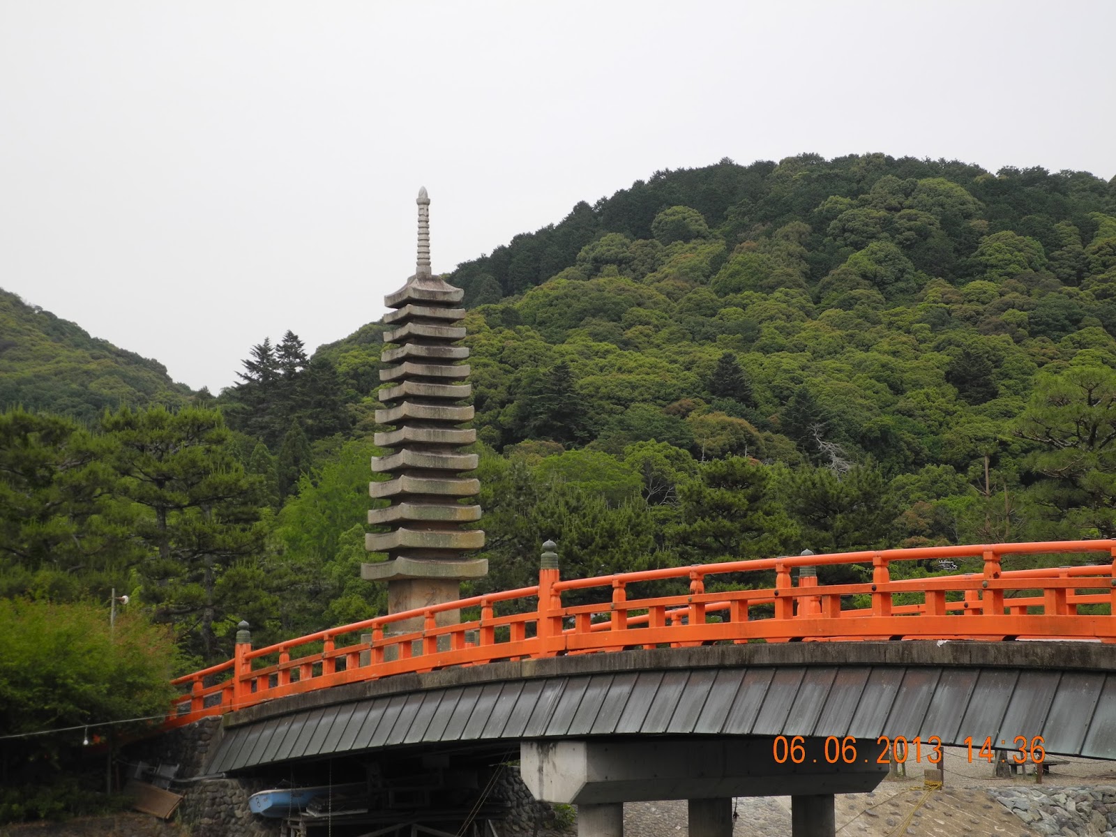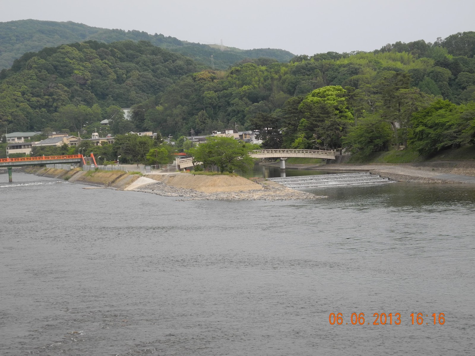 宇治川中央有一沙洲,上建十三層塔,故名之曰塔の島。沿河邊欣賞美麗風景,直行跨越橙色橋就見到。