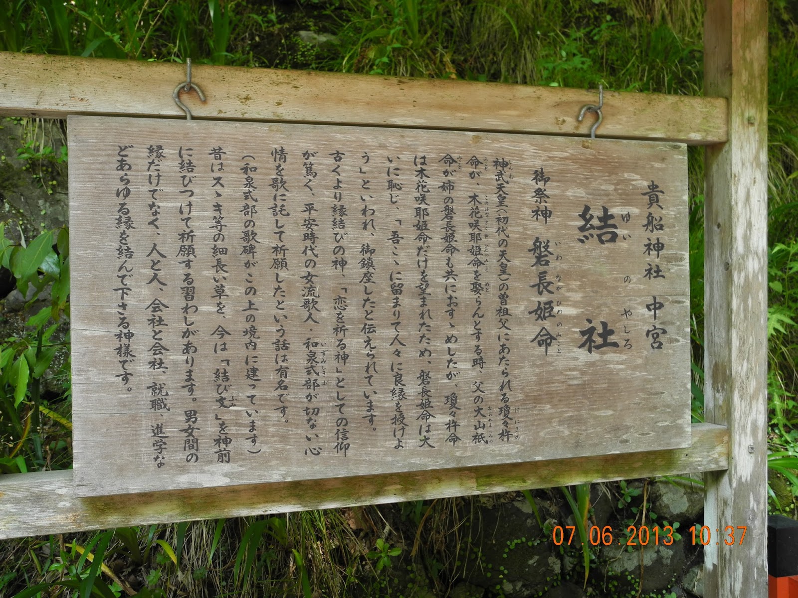 曾祖父曰瓊々杵(唐文音柱,鐵杵磨成鍼之杵。)尊,邂逅女神木花咲(唐文草書笑字,倭文意為花開)耶姬,向其父大山祇命求親。大山允婚之餘,尚使其姐磐長姫陪嫁。杵尊以磐長貌醜,留下木花而遣返磐長。磐長抵貴船川,曰:「吾駐於此,力保世間男女得良緣。」於是成為結緣之神。