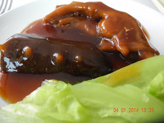 紅燒刺參拼波蘭鵝掌唐生菜,刺參與鵝掌均燜得夠腍,但不知何以鵝掌要來自波蘭。