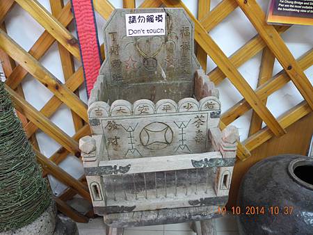 一隻舊木籠,刻滿了「福祿壽全」、「丁財兩旺」、「老少平安大吉」、「茶喜」、「發財」及多種花紋,卻原來是一隻茶籠,後面較大一格用以安放茶壺,前面稍矮一格安置茶杯。