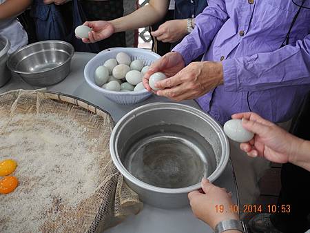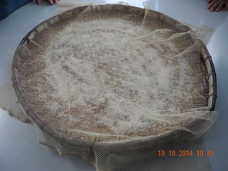 去到另一所棚屋,實習做鹹蛋黃。其法以粗鹽預置底箕上,覆以魚網。