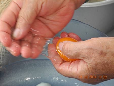 三份之一位置打開鴨蛋,傾於手中,濾去蛋清,蛋黃用清水洗淨。