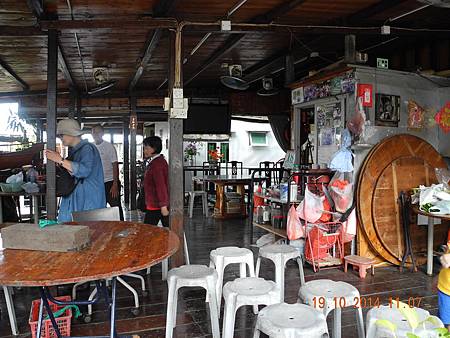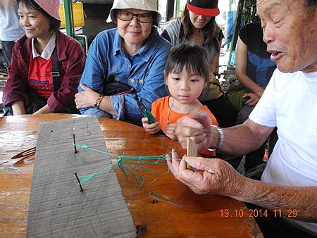 屋主示範編織魚網。 茶果送至此處,食畢已近正午,到酒樓用餐,廿三人分為兩席。