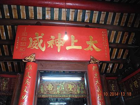 中門匾額:「太上神威。西曆一九五九年。天運嵗次己亥。仲冬吉旦。重修值理……同敬送。陸湛國敬書。」