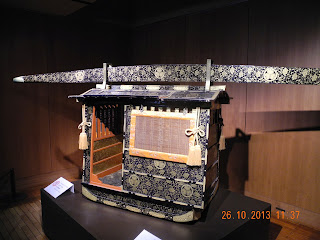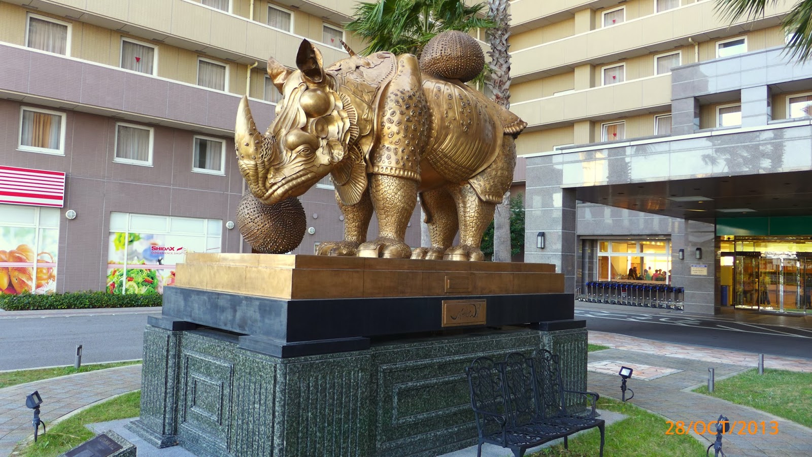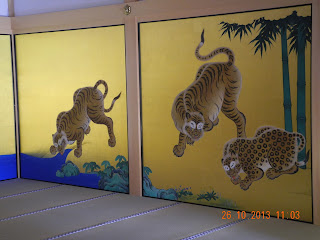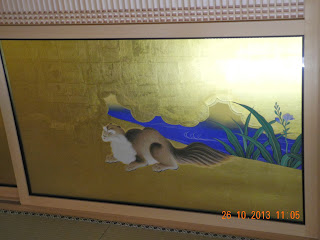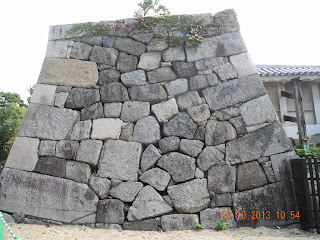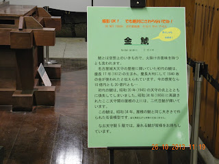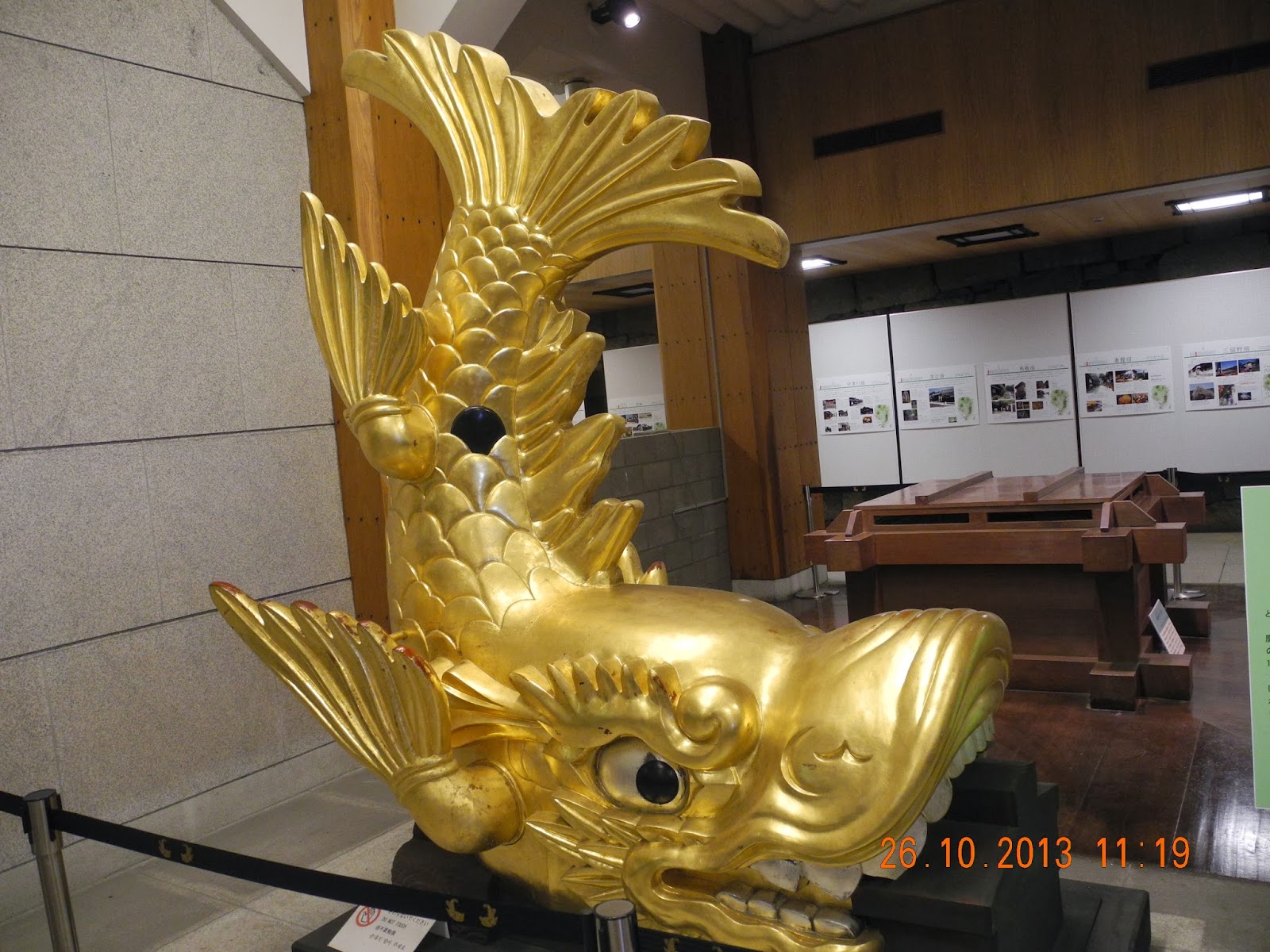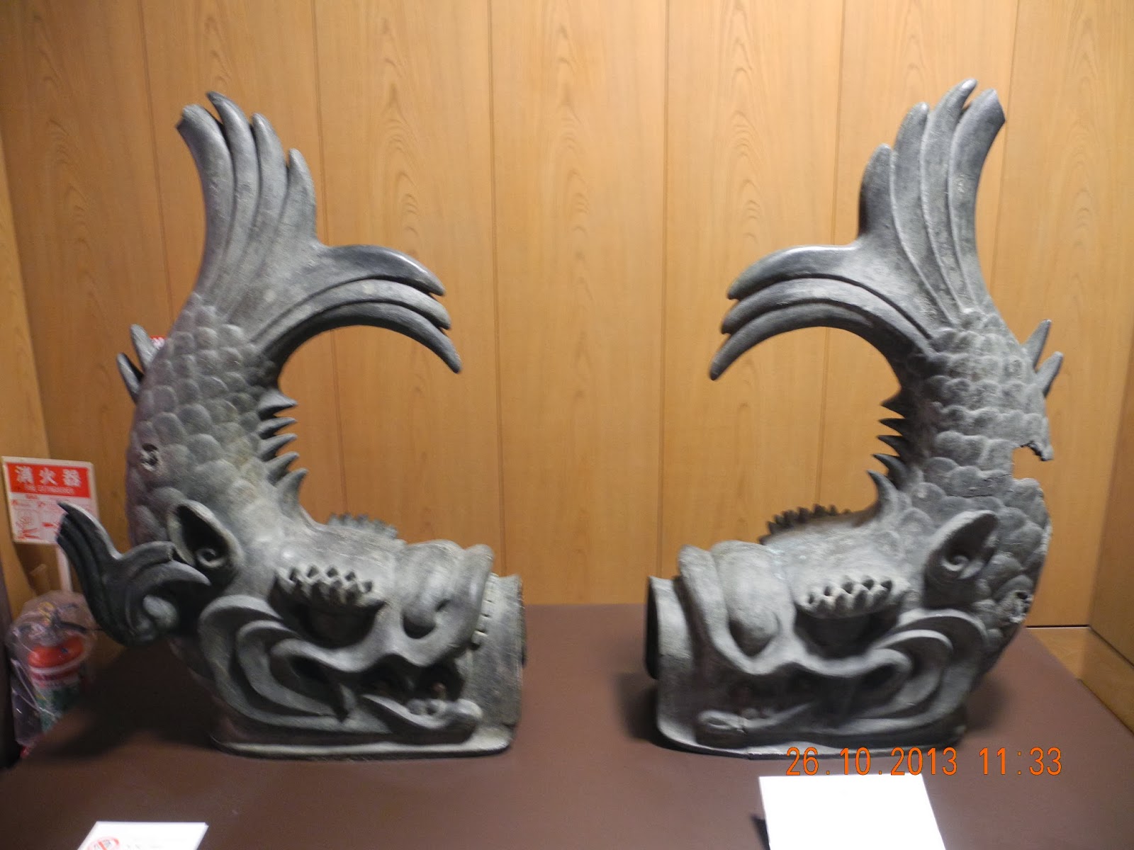 此展品名為鯱,係玻璃纖維仿製,身上一片金鱗已掉,實物如是也。實物一對,置於天守閣正脊兩端。
