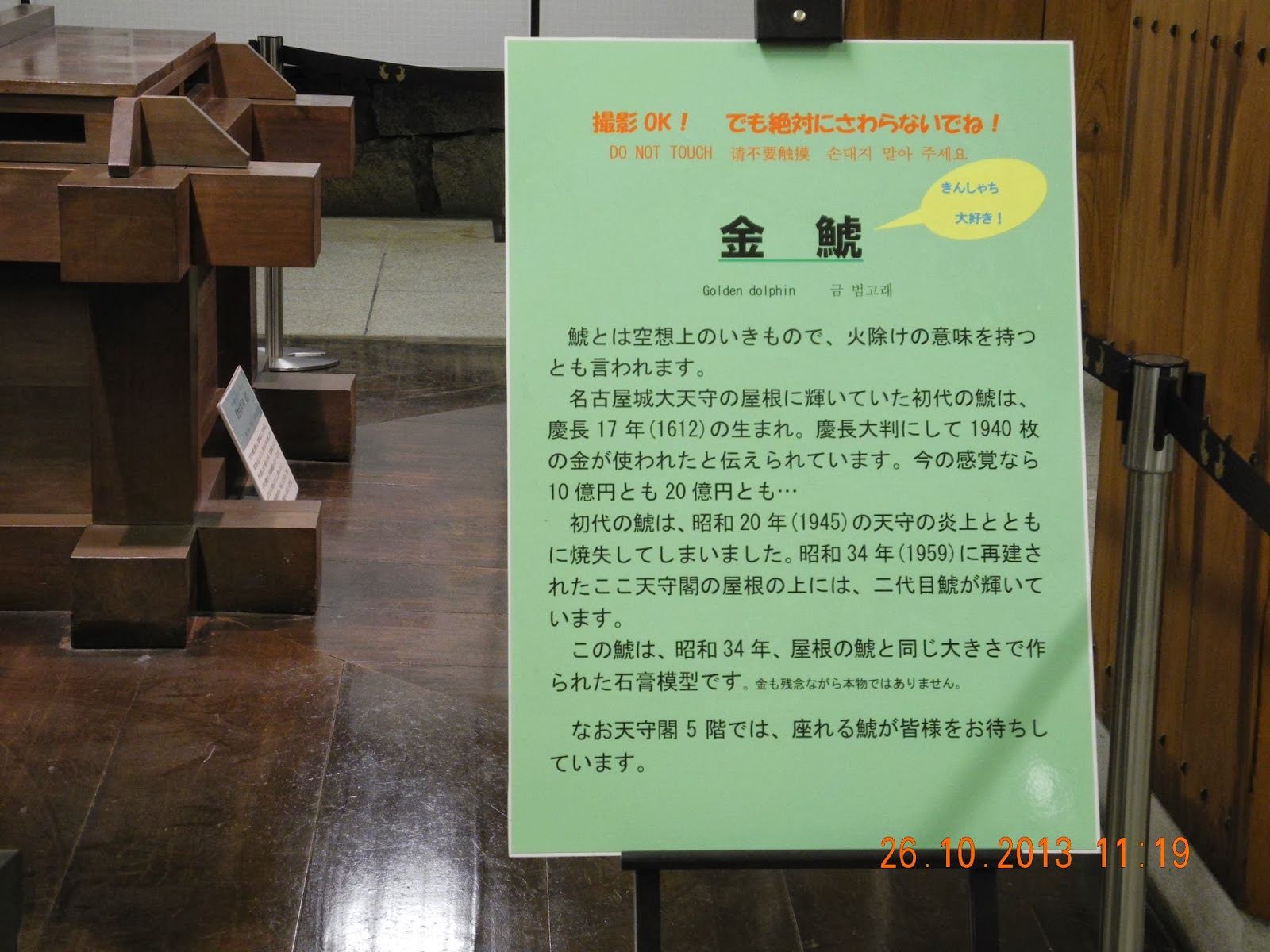 「撮影OK! でも絶対にさわはないでれ! 金鯱きんしゃち 大好き! 鯱とは空想上のいきもので、火除けの意味を持つとも言われます。 名古屋城大天守の屋根に輝いていた初代の鯱は、慶長17年(1612)の生まれ。慶長大判にして1940枚の金が使われたと伝えられています。今の感覚なら10億円とも20億円とも… 初代の鯱は、昭和20年(1945)の天守の炎上とともに焼失してしまいました。昭和34年(1959)に再建されたここ天守閣の屋根の上には、二代目鯱が輝いています。 この鯱は、昭和34年、屋根の鯱と同じ大きさて作られた石膏模型です。(金も残念ながら本物ではありません。) なお天守閣5階では、座れる鯱が皆様をお待ちしています。」
